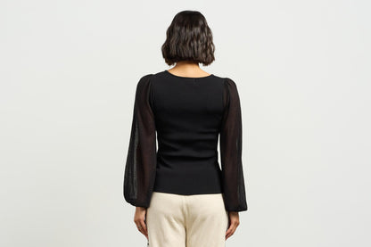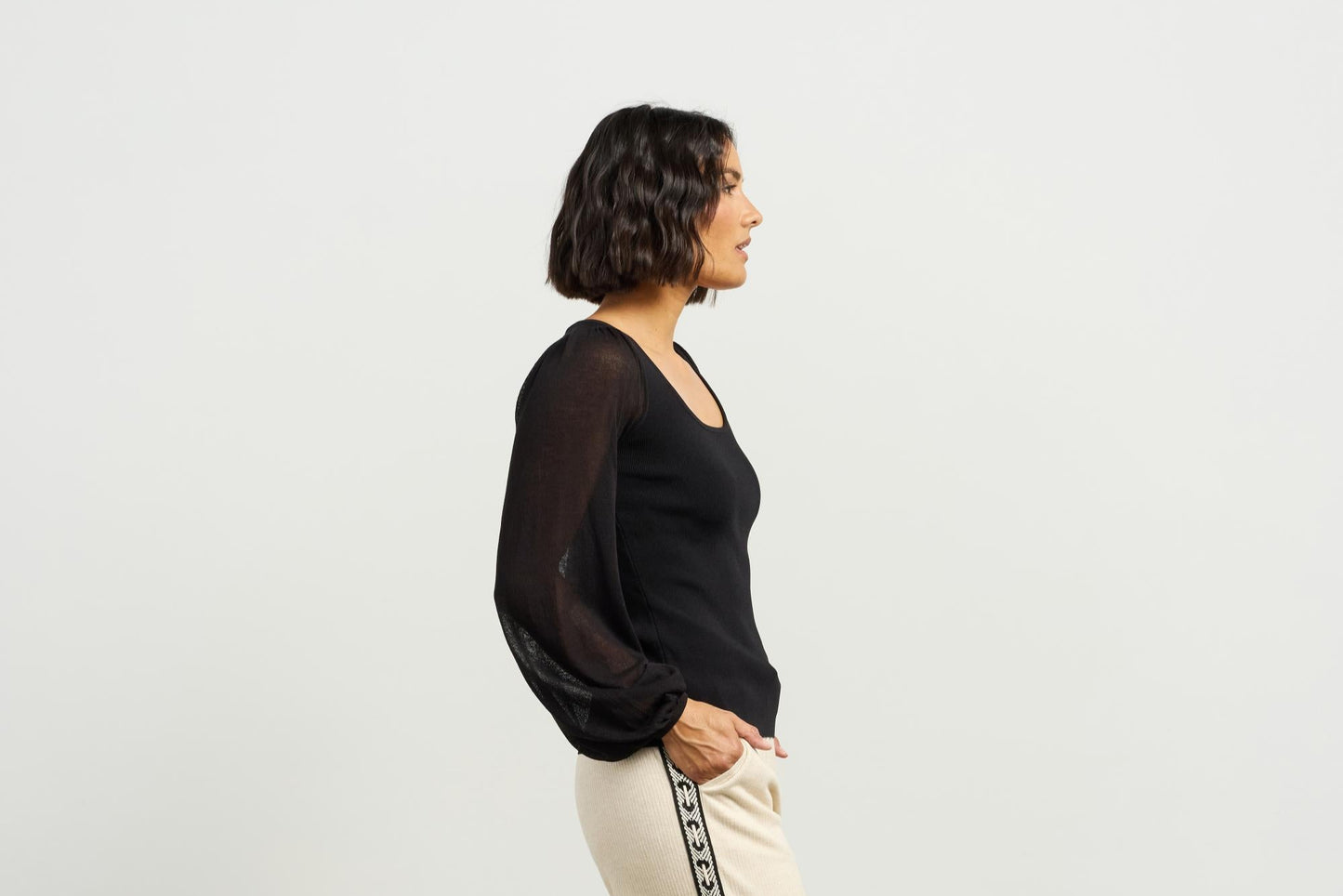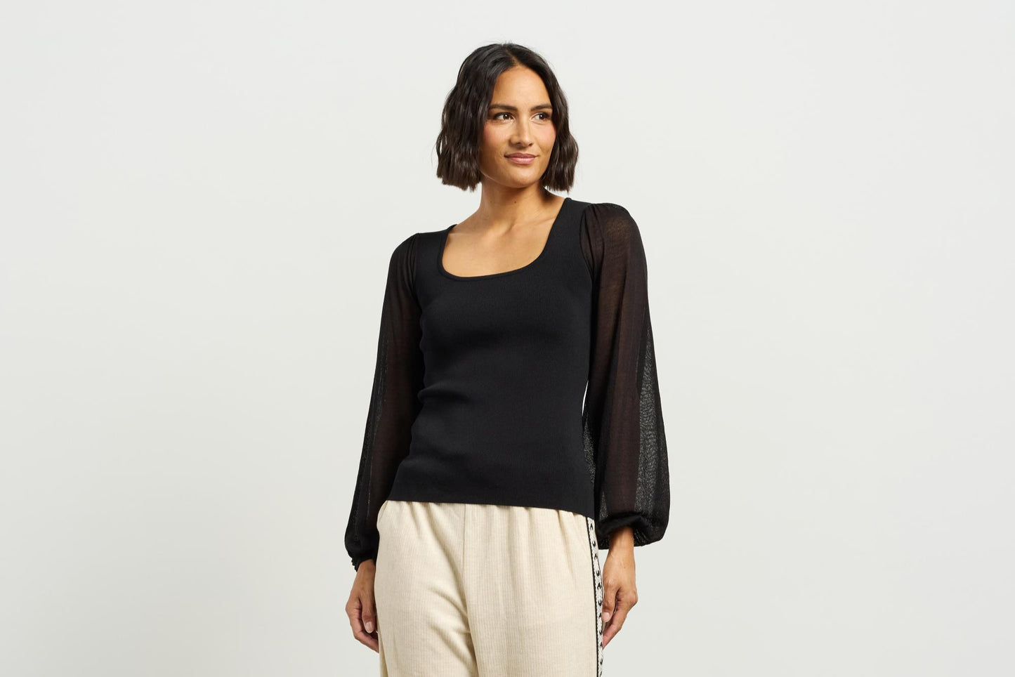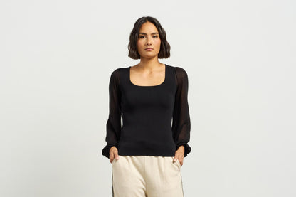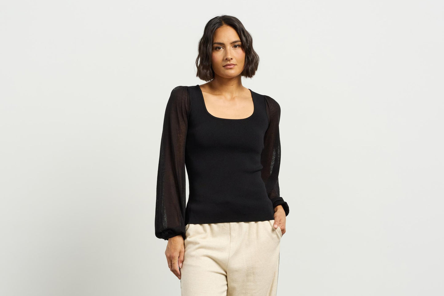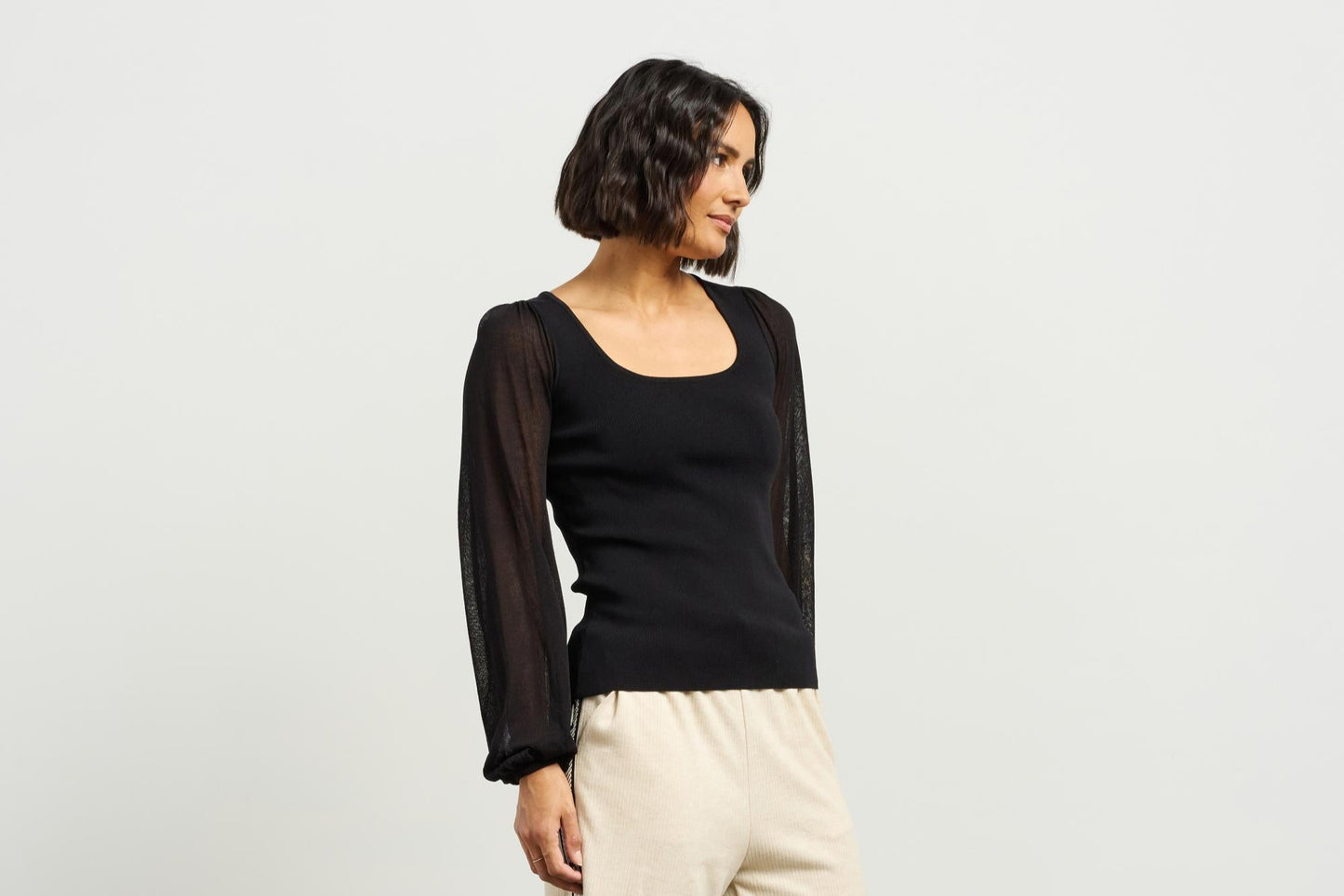 This gorgeous top is crafted from a fine-gauge knit, offering both comfort and a flattering fit. It features a sophisticated square neckline and bell sleeves, that gently flare out for a feminine silhouette and provide balance to the fitted body of the top. Perfect for layering or wearing alone, this top combines timeless elegance with a hint of contemporary flair, making it an essential piece for any wardrobe. Ideal for both casual and more polished looks.