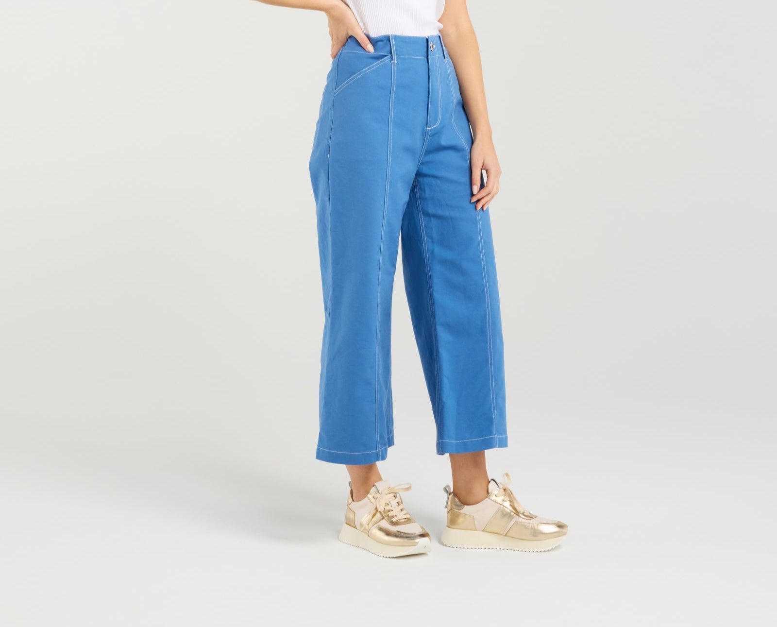 Meet your new non-denim denim crush: these 7/8th wider-legged pants bring major style with a laid-back attitude. Crafted from cotton spandex blend, they feature contrast stitching for that finishing touch. The cropped length shows off your shoes, while the wide leg keeps things effortlessly chic. Perfect for dressing up or kicking back!